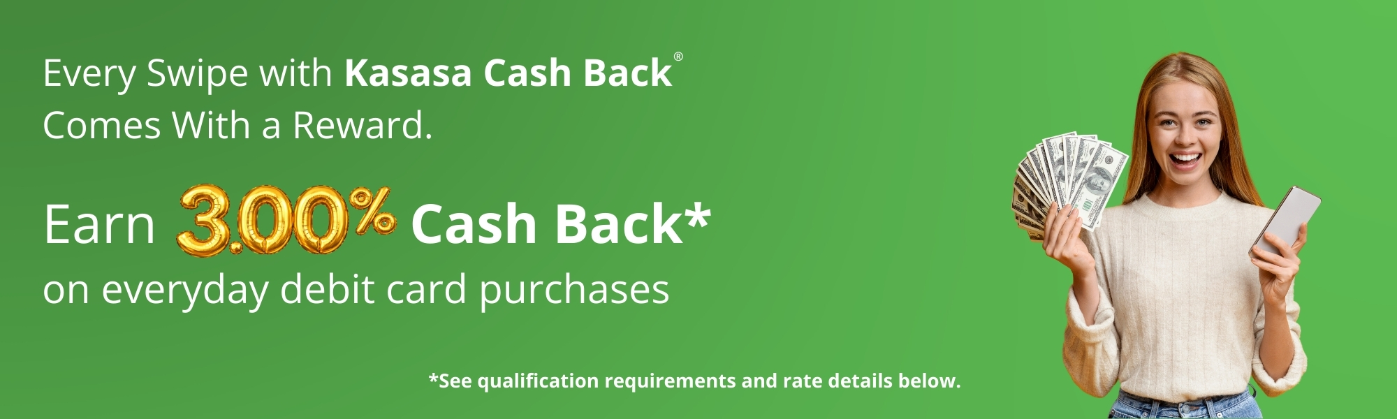 Kasasa Cash Back® is our free rewards program that helps you earn money when you spend money. By signing up, you'll receive the following benefits: